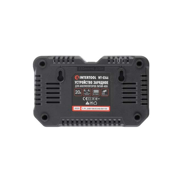 Устройство зарядное для аккумуляторов Li-ion 20 В, ток заряда 4.0+4.0 А, два теминала зарядки INTERTOOL WT-0346 | есть |